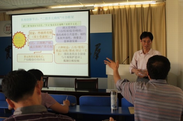 2012年5月17日下午,题为“‘共产’到‘确权’:近百年农村财产权制度改革的马克思主义中国化”的校内教研人员学术讲座在我院会议室举行。讲座由学院首席教授温锐主讲,副院长黄欣荣教授作主持,学院四十余名教职工聆听讲座。