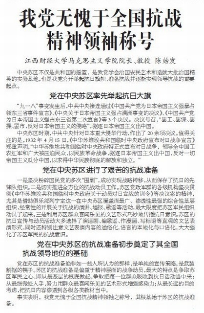 在我省纪念抗日战争胜利65周年之际,以弘扬抗战精神、开创美好未来为主题举行了座谈会。先进基层党组织、优秀共产党员代表和相关学术专家、学者参与此次座谈会,我院院长陈始发教授应邀出席并作重要发言。重要观点论述被摘登在9月3日江西日报B4版。