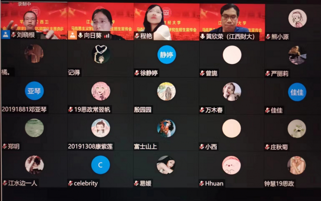 为了向社会各界更好地宣传江西财经大学马克思主义学院,以科学、精准、高效地指导有报考意愿的考生踊跃报考我院,马克思主义学院积极组织老师和优秀毕业生代表参加线上招生宣传活动。6月29日晚,副院长刘晓根、博士生导师黄欣荣、硕士生导师程艳、学工办主任夏贤明、优秀毕业生代表以及百余名考生参加会议。会议由科研与研究生管理办公室主任汤文芳主持。