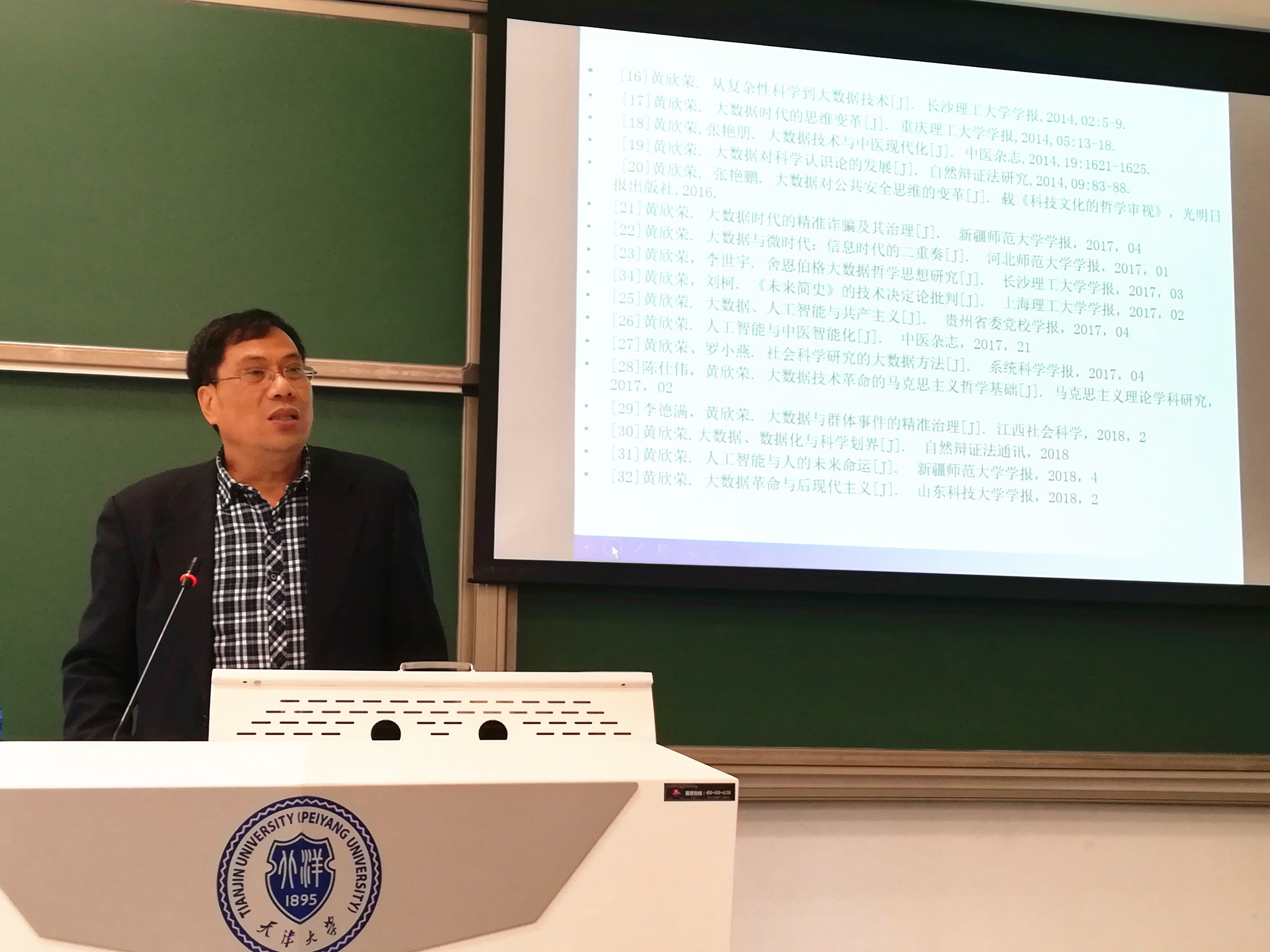 应南开大学哲学院、天津大学科学技术与社会研究中心邀请,4月23日,我院黄欣荣教授分别前往两校做了题为“大数据哲学研究的进展与问题”的学术报告。南开大学的学术报告于23日上午在新校区哲学楼举行,哲学院师生参加了报告会。天津大学的学术报告于23日下午在天津大学新校区举行,科学技术与社会研究中心的师生参加了报告会。