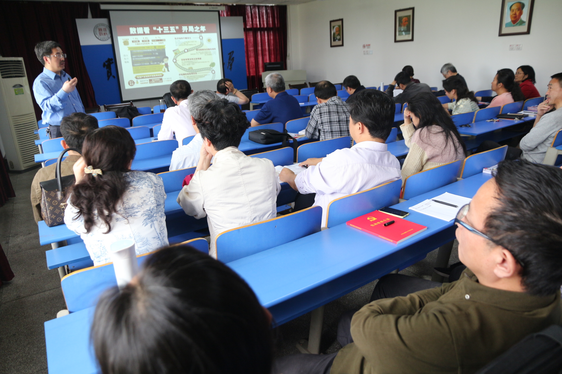 蒋校长的党课格局大、眼界宽、接地气、有见地,历时两个半小时,全体教职员工始终认真听讲,认真做笔记,都感觉深受启发,收益良多,很有体会,纷纷表示一定把蒋校长党课上大量引人入胜的信息、案例和数据带进课堂,进一步提升马克思主义信仰教育的亲和力和针对性,为全面提升我校教学水平做出更大贡献。(文图/唐海燕 刘柯)